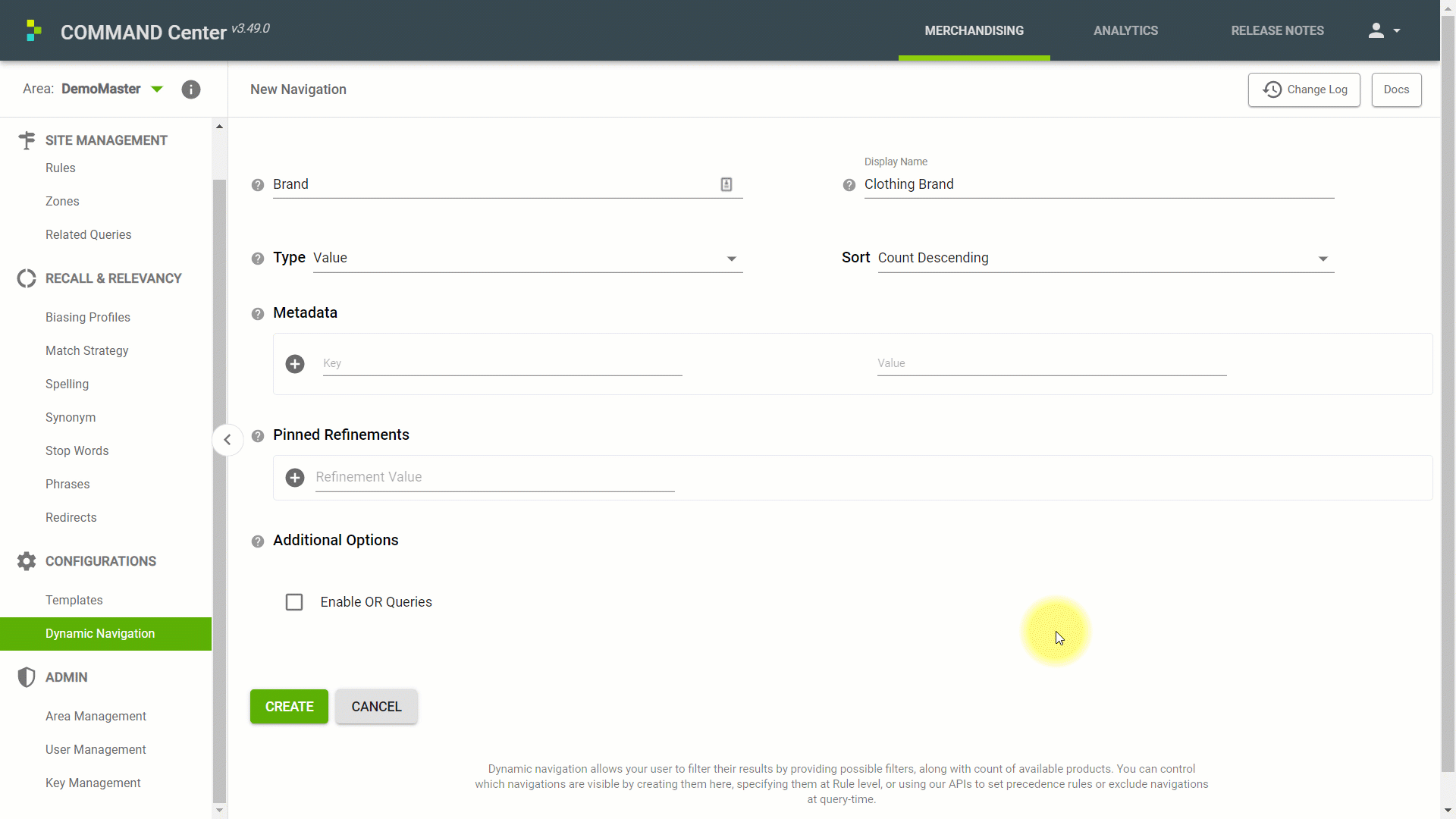 Pinned refinements can be used to control the order of the first twenty refinements returned by the engine. This allows you to promote specific brands or styles, as well as set a limited manual sort order for sizes or dimensions. Any remaining refinements that are available will be returned in the order defined in the Sort dropdown.