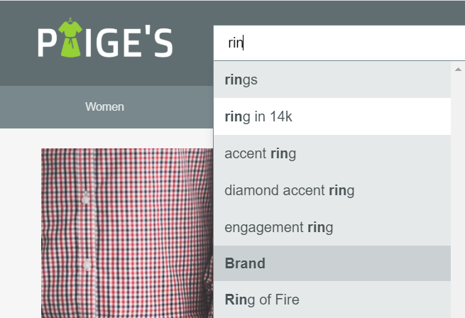 In this example, you see the recently executed search for red dress, followed by popular keywords. For more on Search As You Type and how to bring back the Navigations, please see the SAYT documentation.